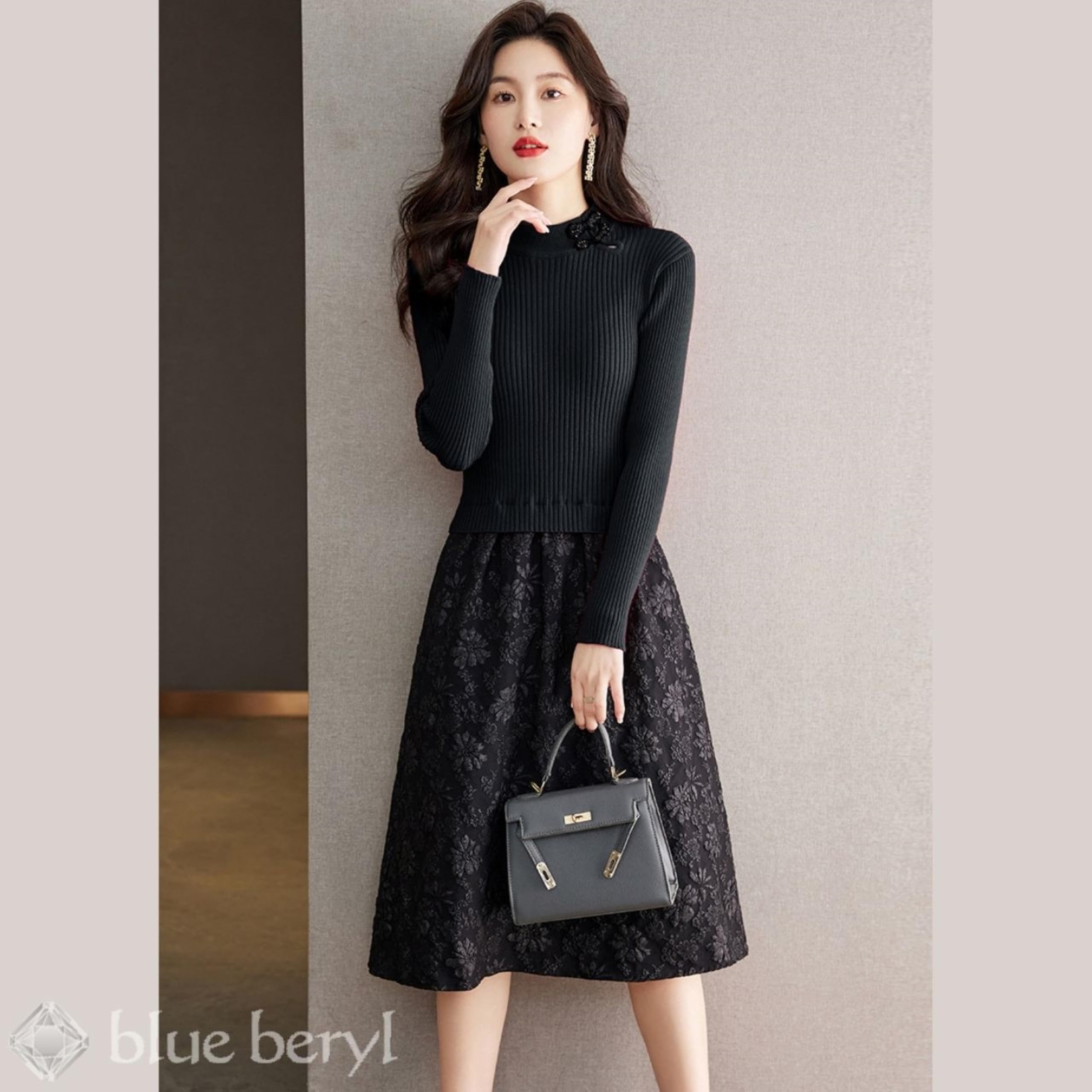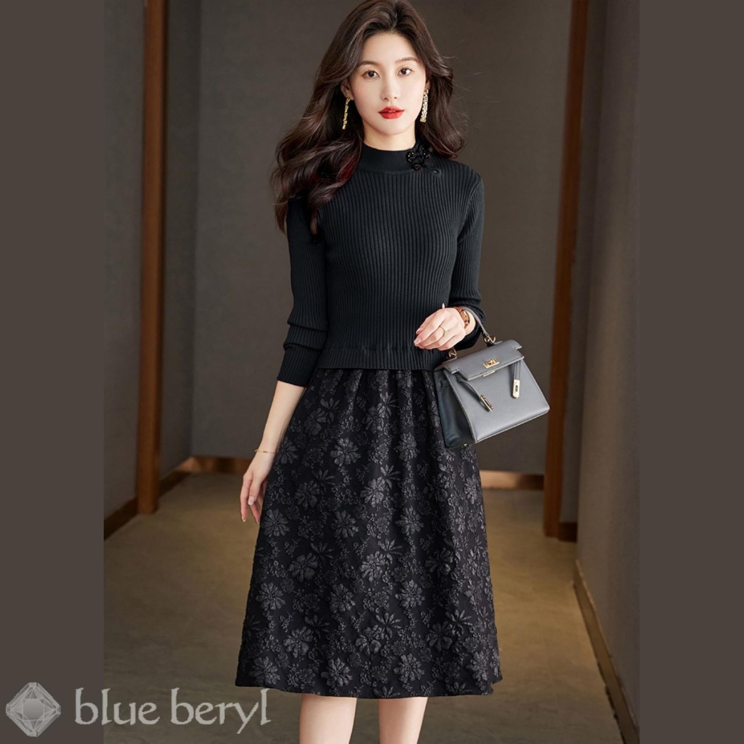 [blue beryl] [ブルーベリル] ドッキング ワンピース レディース 異素材切替 リブニット 花柄 フレア 長袖 チャイナボタン BB023