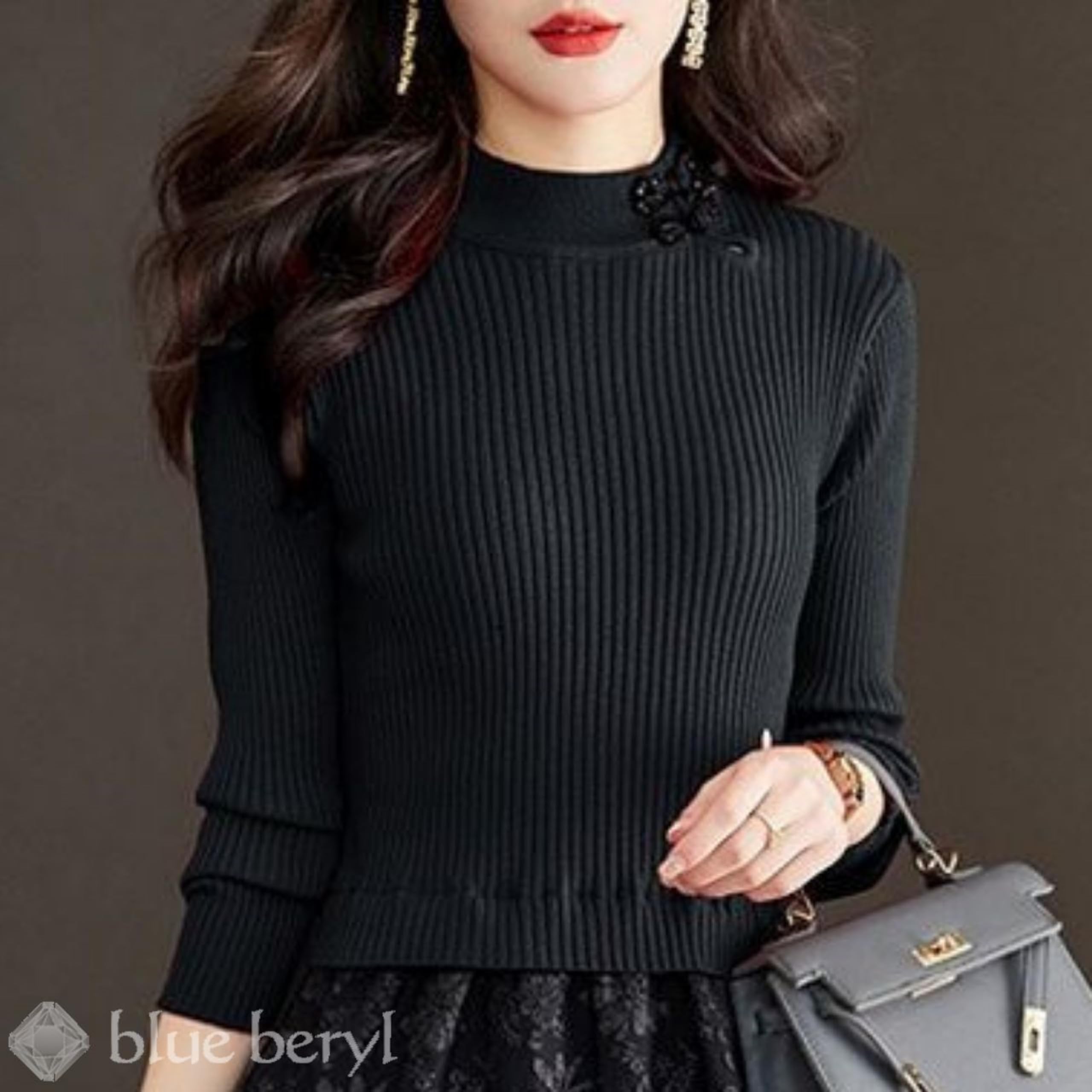 【チャイナボタンがきらめきを添えて】 首元サイドのホールがひとさじのセンシュアルをプラスして。マット感のあるニット素材に、ほのかにきらめくビジューをあしらったチャイナボタンが、艶やかなノスタルジックムードを添えるアクセサリー代わりに。控えめで品のある華やぎが、大人の様々なシーンに彩りを添えてくれます。