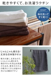 【日本製 タオル】大阪泉佐野工場で織り、和泉山脈の天然水で洗い上げたタオルです。タオルを織り上げてから水洗いや染色を行う大阪泉州タオル独自の後晒製法により、使い始めから柔らかな肌触りと吸水性の良さを感じていただけます。外国製タオルが主流の昨今、身近なものだからこそこだわりたい日本製タオルです。