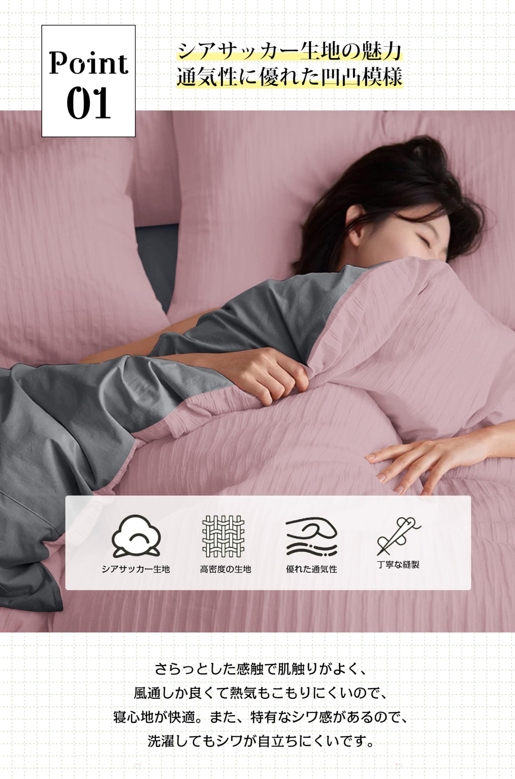 【シンプルなデザイン】シアサッカー生地&クシュクシュ加工が可愛い!表面の凹凸によって、生地が肌に触れる面積が少なくて、肌と生地の間に空間ができるため通気性がよく快適に過ごせます。しわになりにくく、色落ちしにくく、毛玉ができにくく、快適な睡眠を誘います。どんな季節でも気軽に洗えるから、清潔にお使い頂けます。お部屋の雰囲気がぴったり合わせます。布団カバーの側面の全開ファスナーのデザイン、使い勝手が良いです。装着やすい、取り換えも簡単です。「掛布団カバー」が揃うお得な寝具カバーで、洋式・和式兼用でマットレスでも敷布団でもご使用いただけます。