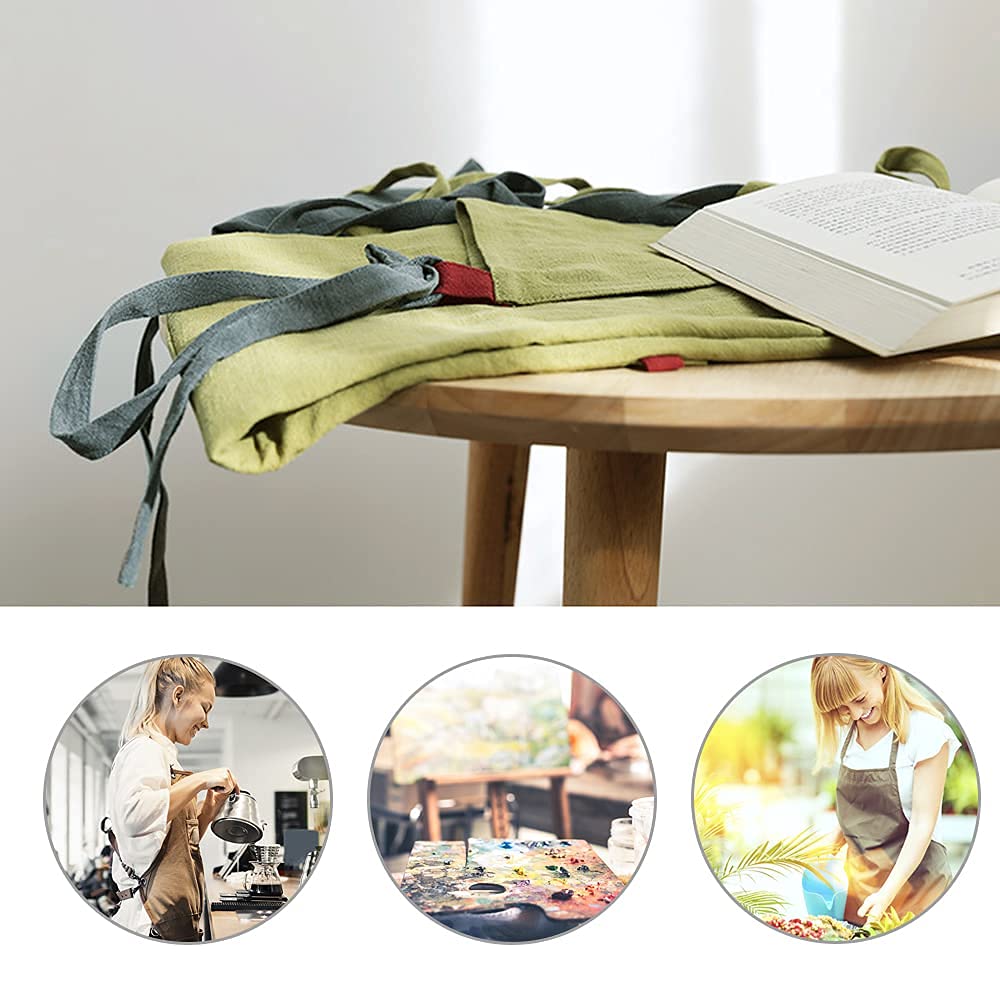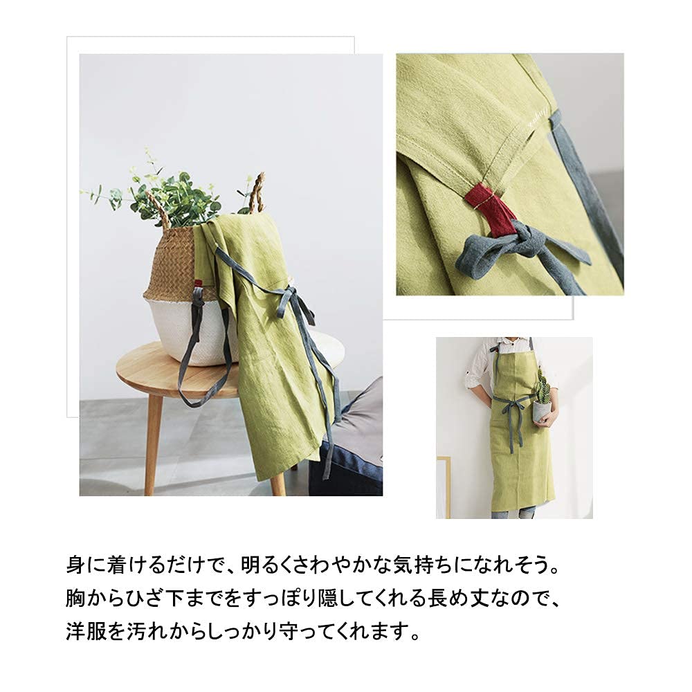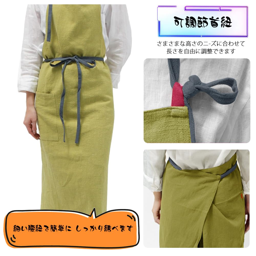 【高品質-リネン エプロン レディース】(麻)30%、綿70%、非常に柔らかく肌に優しいエプロンを採用。使うほど韻味があり、麻特有の垂順な質感がとてもおしゃれです!シンプルなデザインで、このエプロンのスタイリッシュなデザインは、細長いウエストと首の曲線を特徴とし、女性的で美しい外観を演出しています。
