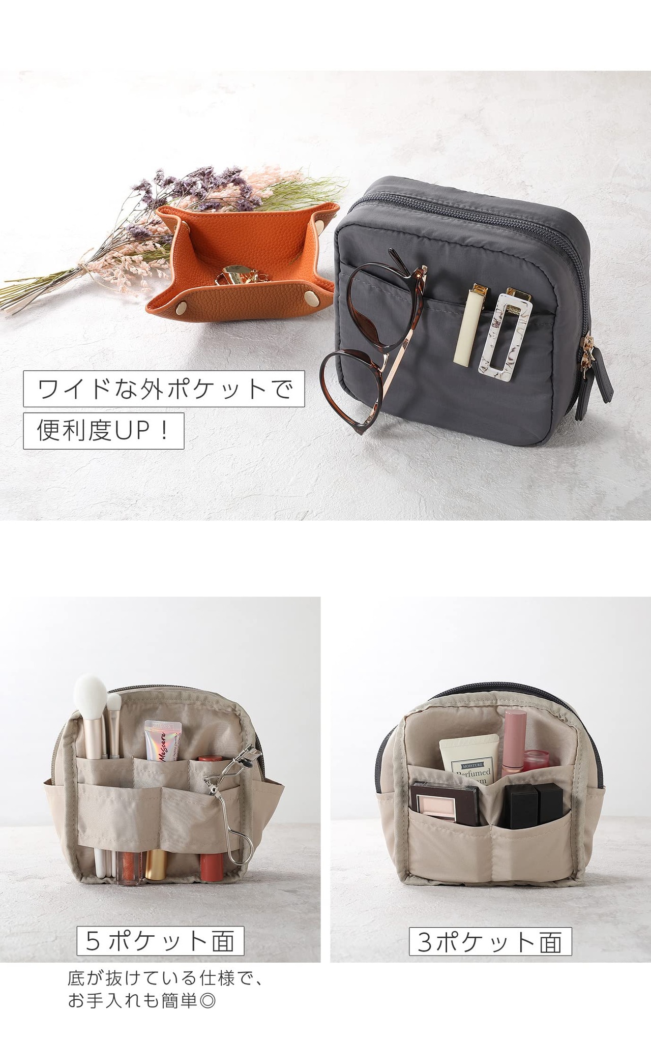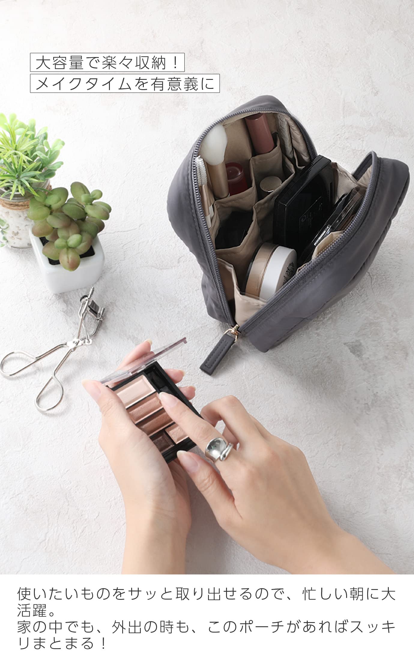【大容量で楽々収納】使いたいものをサッと取り出せるので、忙しい朝に大活躍。家の中でも外出の時も、このポーチがあればスッキリまとまります。パウダー、下地、ビューラー、ハイライトなどの大きめのコスメから、マスカラやリップやブラシという縦長のコスメも常に持ち歩く日焼け止めやファンデーションもしっかり収納可能です。