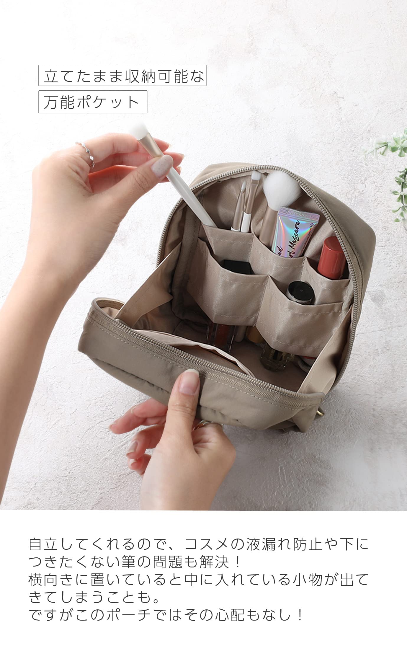 【使いやすい縦型収納】自立式の化粧ポーチで、欲しい物がすぐに取り出せます。リップやマスカラも縦型だから入れやすく取り出しやすくなっています。汚れが気になったり、見つけにくかったりとストレスが多くなりますが本製品は掃除しやすいのも特徴です。これまでの多くのお悩みから収納力、機能性、見た目など解決する化粧ポーチとなっております。