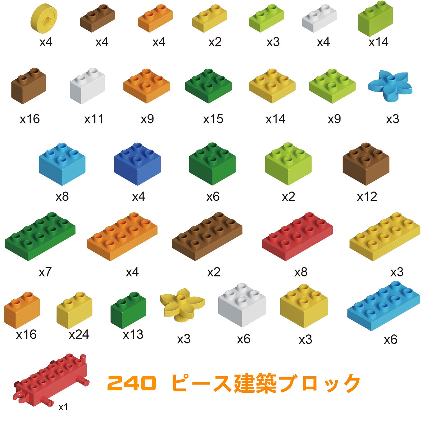 【240ピースの大きいブロック】本製品多様な色と形を含む240ピースのビルディングブロックの完全セットを受け取ります。この大きいブロックセットには、子供たちがさまざまな形を作ることができる建築創造のガイドも含まれています。さらに、デュプロ 互換のため、他のブロック玩具とも併用可能です。
