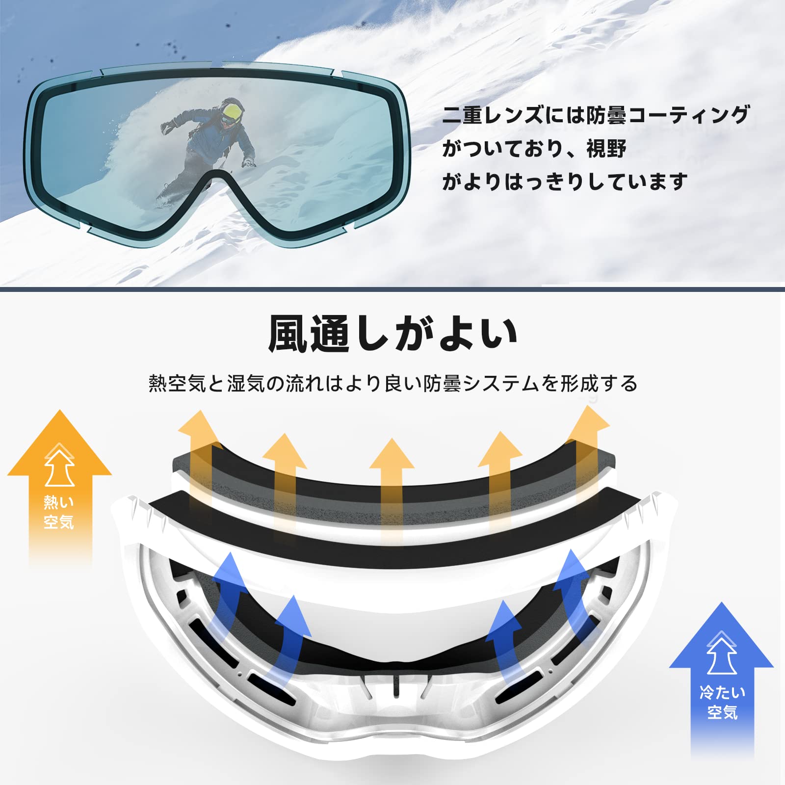 【高性能ダブルレンズ】:スキーゴーグルは高度なダブルレンズ構造を採用。❄️イタリア製のインナーレンズには、PRO 耐久性防曇性能素材と特殊コーティング技術を採用しています。レンズ間の空隙により断熱性が効果的に向上します。ベンチレーションシステムと併用することで、スキーやスノーボード時の曇りを確実に防止します。❄️レンズの外側には防水コーティング技術を採用し、氷や雪がレンズに付着するのを防ぎます。❄️また、超硬技術で作られたアウターレンズは、耐擦傷性を向上させることができます。上部と下部のフルチャンネルベントは、レンズ内部の熱放散のために設計されています。❄️新鮮な外気を吸い込み、内部の暖かく湿った空気を排出し、理想的な空気の流れを制御し、曇りを防ぎます。優れた耐引っかき性、二重の防曇性、100%のUV保護、および耐風性を備えています。