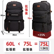 【大容量の75L防水リュックサック】サイズ:約縦60cm(拡張時72cm) × 横38cm × マチ23cm、収納可能サイズ: 60-75L、重さ:1.5Kg。スクエア型収納力抜群、最大17インチPC、Pad、A4サイズの書類や着替え、サングラス、帽子など必要なアイテムを、まとめて収納。キャンプや登山道具、旅行なら3~5泊分の荷物が余裕で入り、タウンユースだけでなく、非常時持ち出し用の防災リュックとしても十分ご活用いただけます。