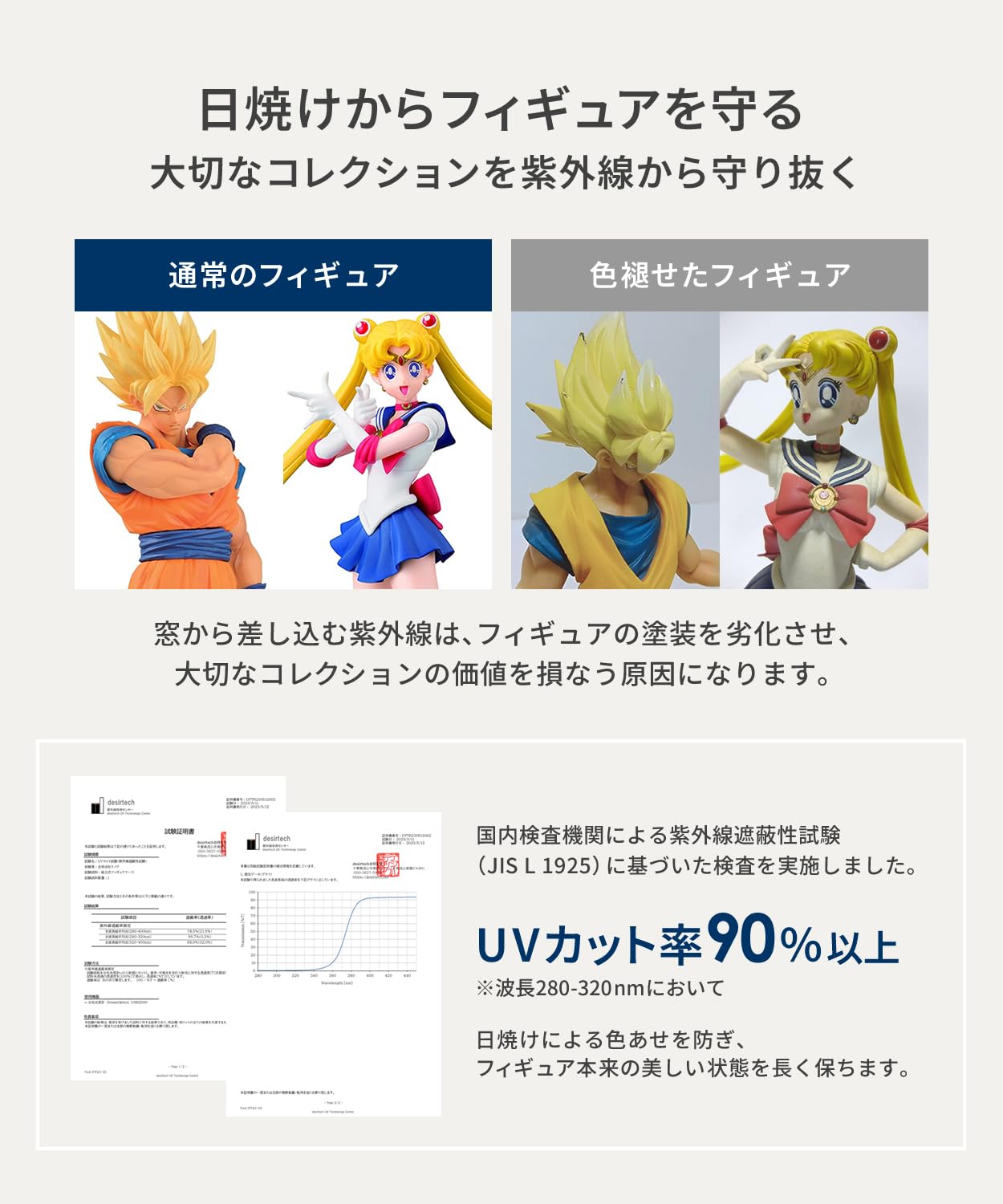 【UVカット率99.3%】(※2023年5月12日 検査実施済) 紫外線による色あせや劣化をしっかりガード。 国内第三者機関による紫外線遮蔽性試験(JIS L 1925 準拠)をクリアしており、大切なフィギュアを長く美しく保護します。