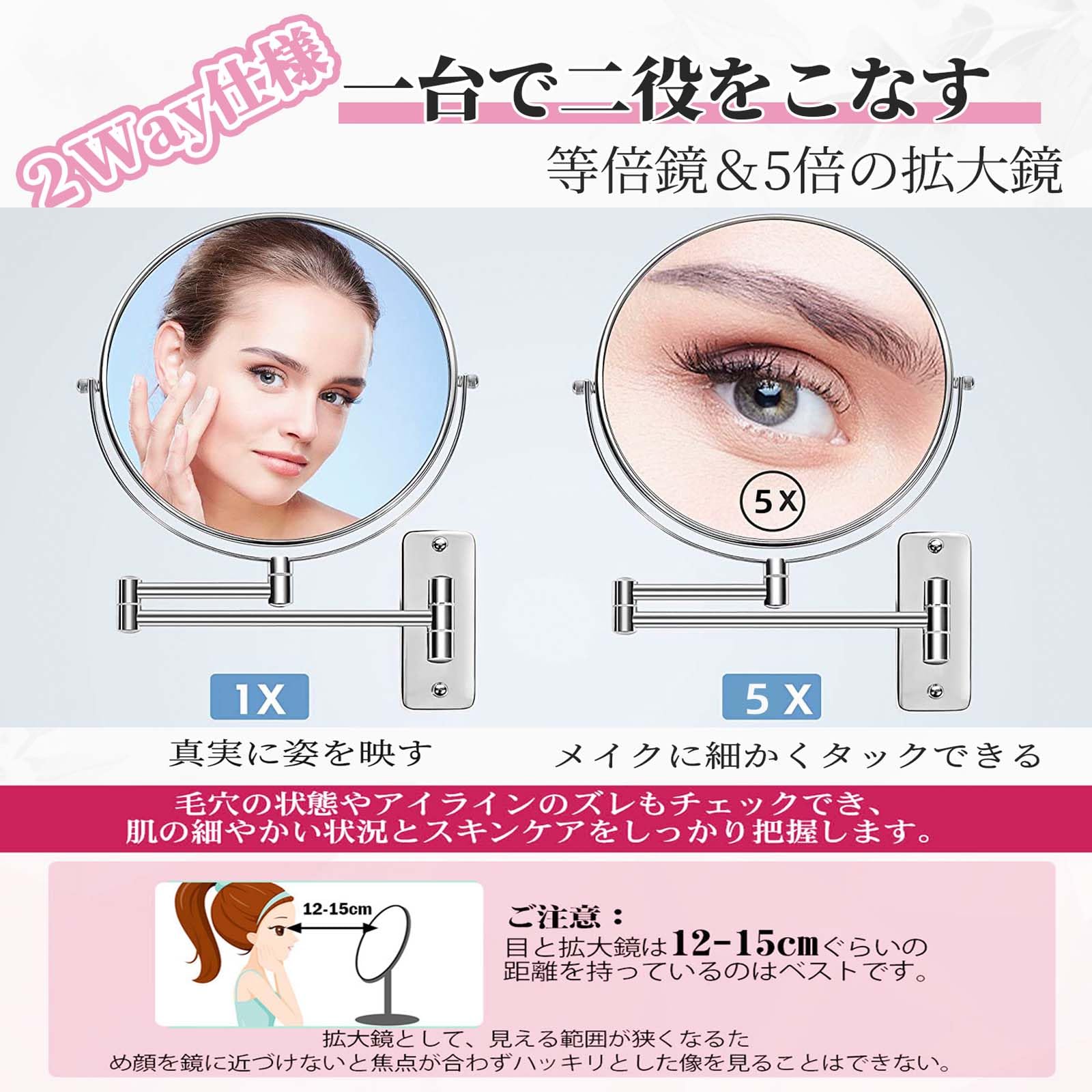 【等倍鏡&5倍の拡大鏡2Way仕様】洗面所アームミラーは両面拡大鏡です。一台で二役をこなす、等倍鏡は自然な姿を真実に映っています。5倍鏡は顔の特徴を拡大して、毛穴の状態やアイラインのズレもチェックでき、肌の細やかい状況とスキンケアをしっかり把握します。視力の悪い方でもメガネ無しで上手にメイクやヘアセットなどできます。スキンケア、ニキビを潰すなど細かい作業もしやすい、お肌の細かいところまで隅々チェックできます。メイクを楽にお楽しみいただけます。
