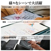 【ペン先摩耗低減】:特殊コートにより、ペン先摩耗度を従来の50%に軽減しております。【反射防止】:アンチグレア加工で光の反射や映り込みを防止します。【表面硬度3H】:3Hの鉛筆でひっかいても傷がつかない硬度で、画面への傷を防止します。【耐久性】:500gのスタイラスペンでの耐擦傷性試験にて、5000回の試験を行っても品質の劣化は認められませんでした。