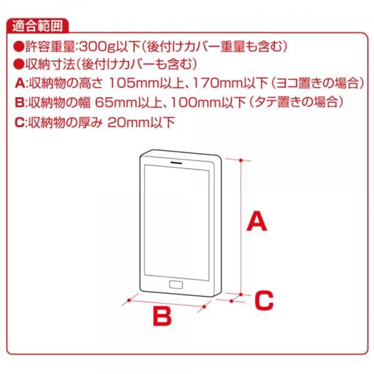 ●許容重量:300g以下 ●収納寸法(後付カバーも含む):収納物の幅65mm以上、100mm以下(縦置き使用時)、収納物の高さ105mm以上、170mm以下(横置き使用時)、収納物の厚み20mm以下