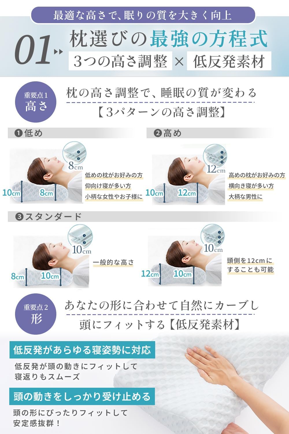 【日本人の求める3パターンの理想の高さを提案!】あなたの好みや身体の状態に合わせて枕の高さは8cm,10cm,12cmに調節が可能!低めの枕がお好みの方から高めの枕がお好みの方まで全ての方にフィットする高さをご提案。3枚の層の内、2枚を使用することで8cm,10cmの高さに、3枚を使用することで10cm,12cmの高さに調節が可能です。頭部への負担を和らげ、快適な寝心地をお届けします。詳しい高さ調節方法は取扱説明書に記載しております。お届け時は3枚の層を使用した状態でのお届けとなります。まずは3枚の層を使用してフィット感をお試しください。
