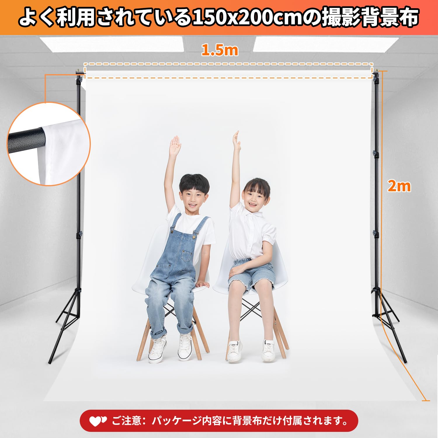 パッケージ内容:1.5m x 2mの背景布 白布×1枚 ご注意:1.背景布 白の幅は約150㎝、縦は約200㎝の大きいサイズのため、背景布は折り畳んで出荷しており、もし届ける際にしわがある場合、使用前に先ずスチームアイロンをかけてください。2.普通の電気アイロンを使う場合、一時停留等せずにポリエステル専用モード(低温)に設定してアイロンしてください。3.白布は汚れると、手洗いも洗濯機洗いも対応可能ですが、洗濯後、是非平に干してください。