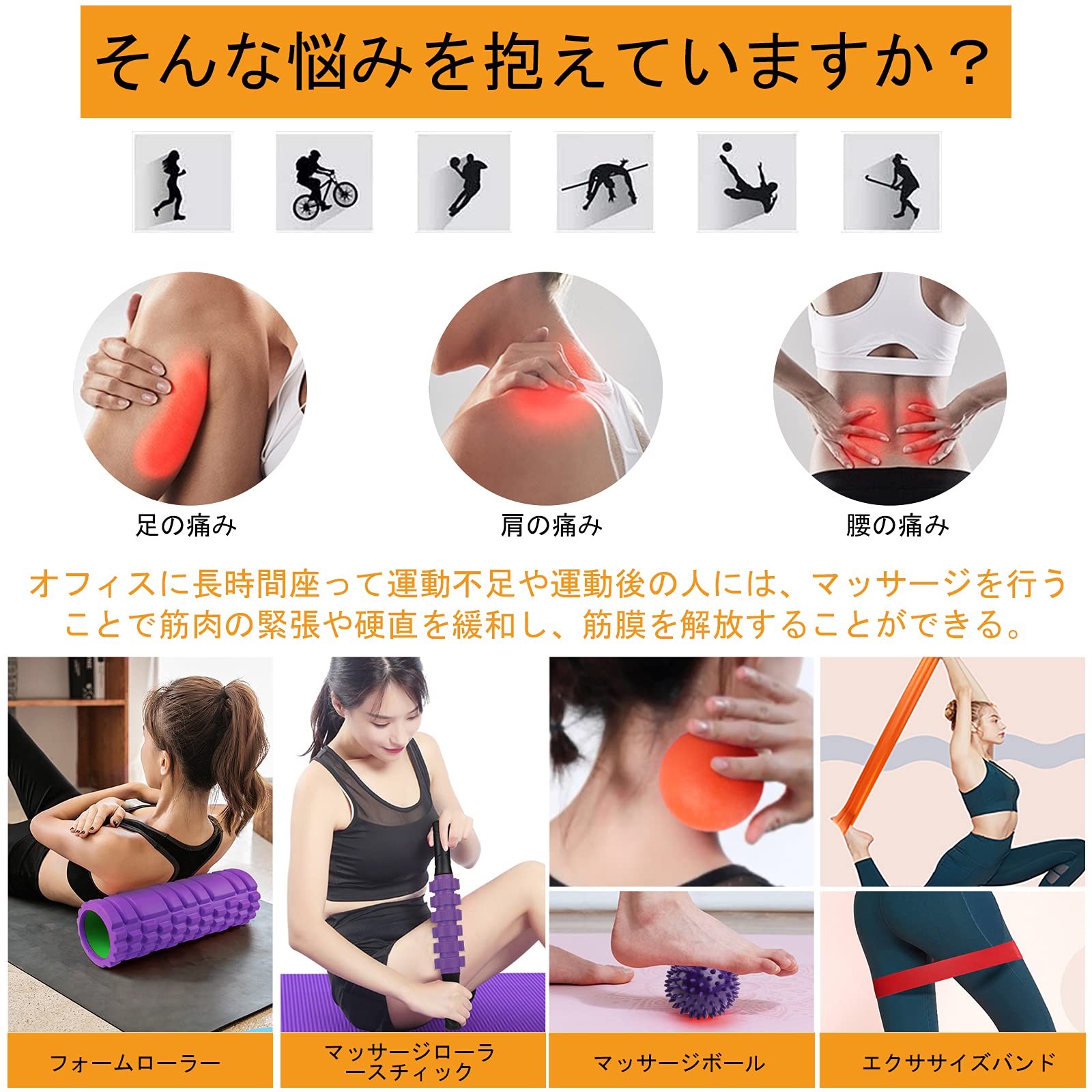 【7点全身のきんまくリリース ローラー セット】ヨガポールx1、マッサージローラースチィックx1、マッサージボールx2、エクササイズバンドx2、日本語マニュアルx1、収納袋x1を含めます。ヨガ、ジム、旅行先など様々な場所で使えます。どこでも首からつま先まで全身の筋肉をしっかり揉み解せます!