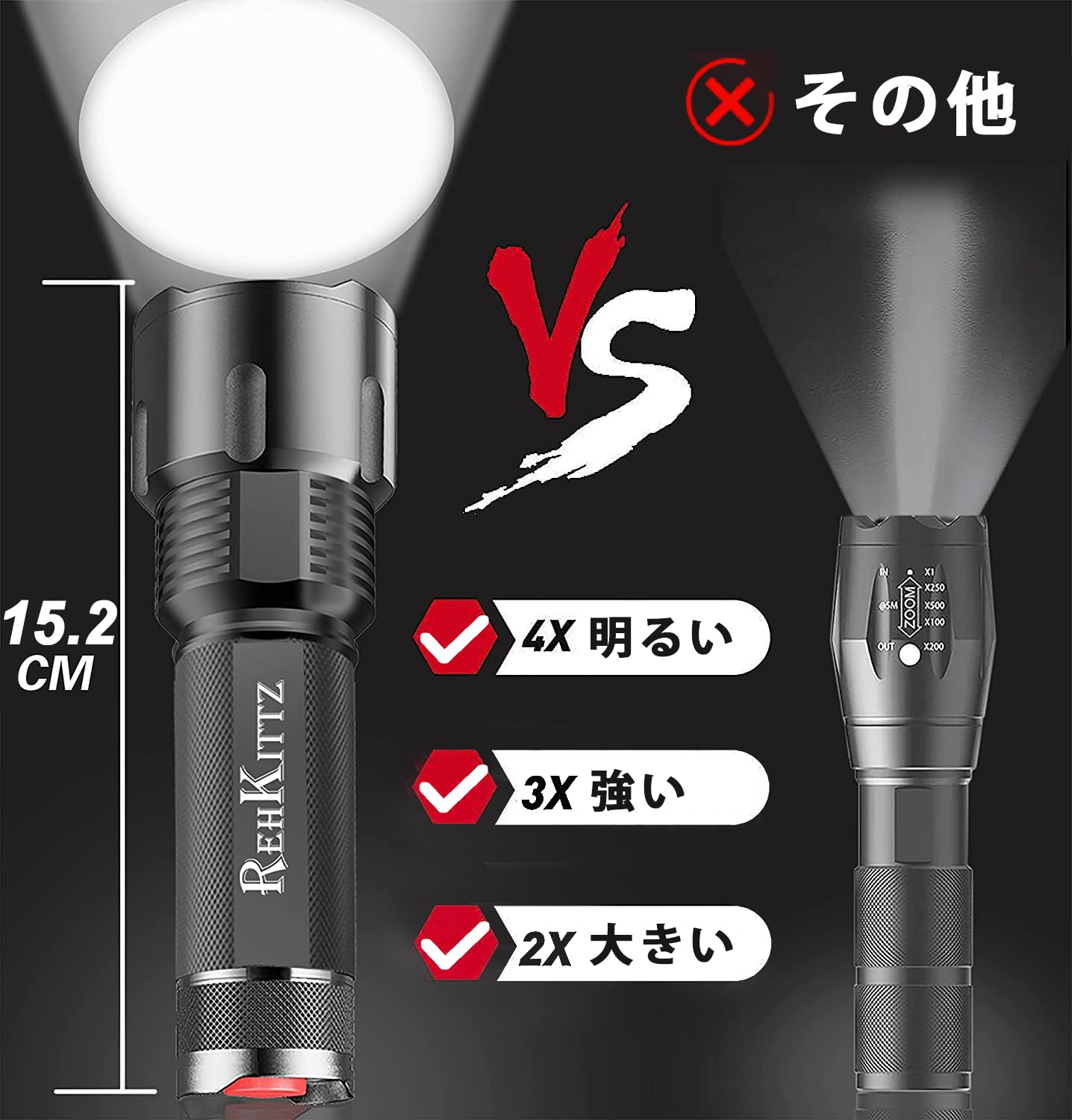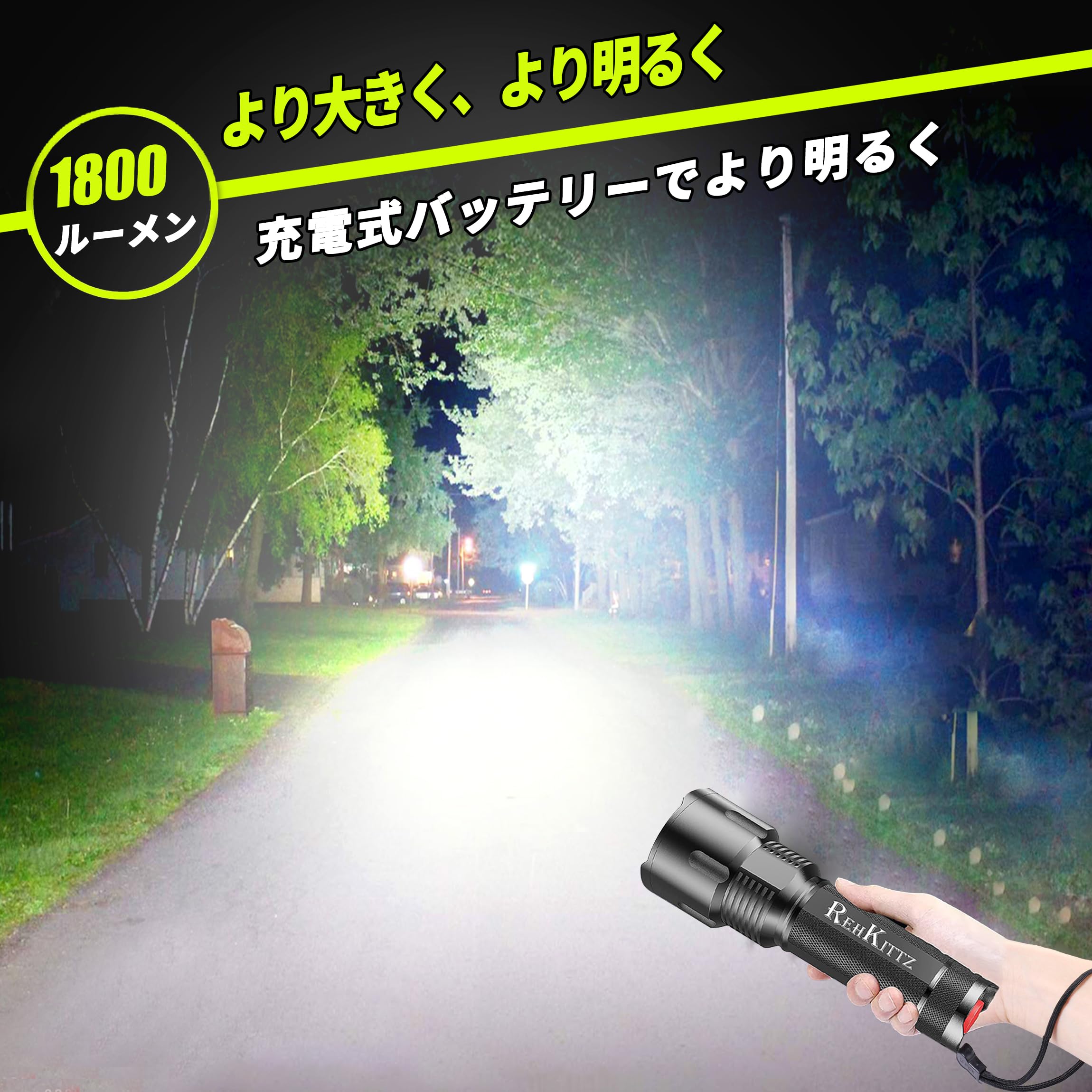 REHKITTZ 防水機能 懐中電灯 LED フラッシュライト超高輝度1800ルーメン 強力 軍用 高耐久性 停電 防災 地震 停電対策 防犯対策