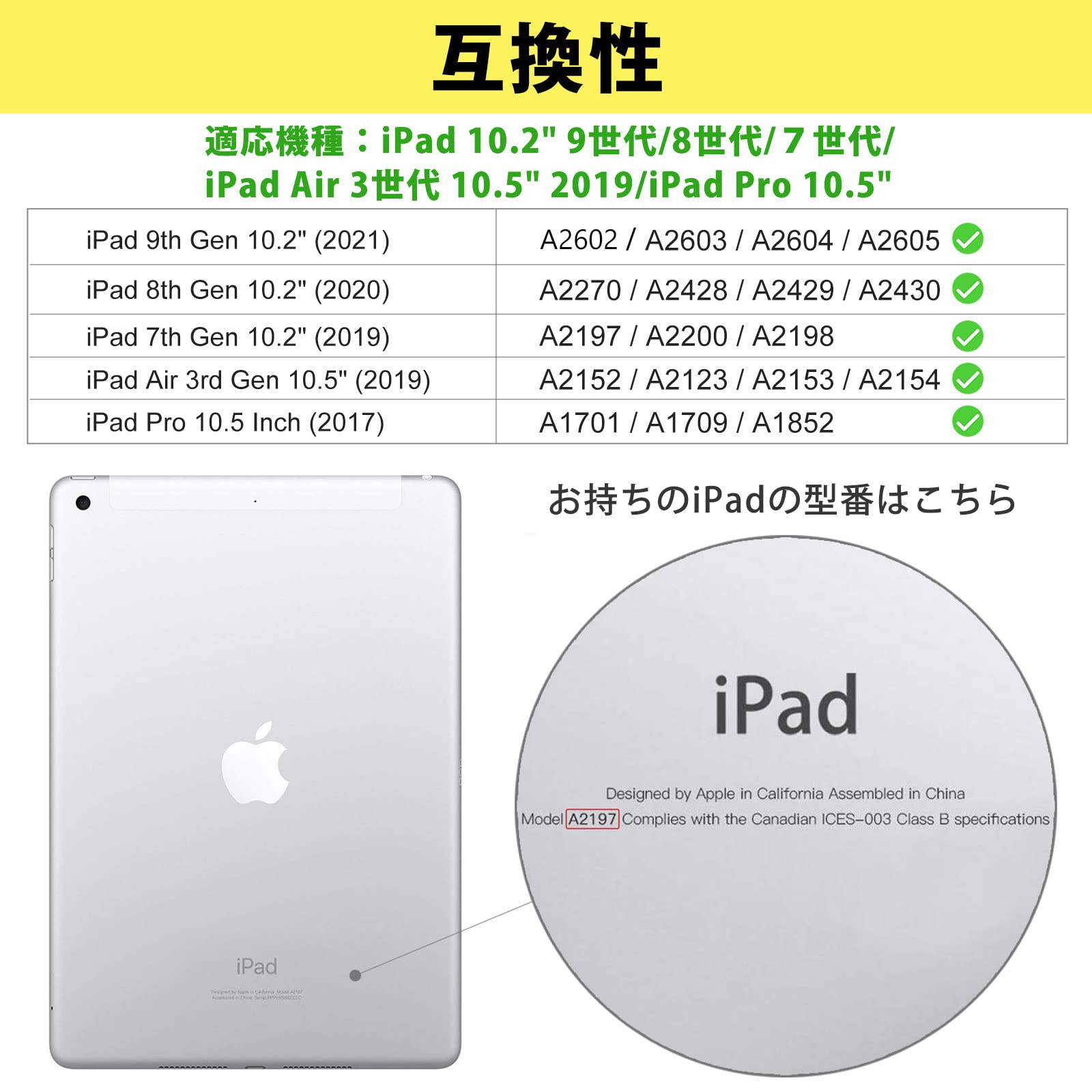 対応端末: iPad 10.2" 第9世代 2021 (A2604 A2605 A2603 A2602)/ 第8世代 2020 (A2270 A2428 A2429 A2430)/ 第7世代2019(A2197 A2200 A2198)、 iPad Air 第3世代 10.5" 2019 (A2152 A2123 A2153 A2154)、 iPad Pro 10.5” 2017 ( A1701 A1709 A1852)、その他の型式に対応しません。ご購入前、モデル番号をご確認いただきます。