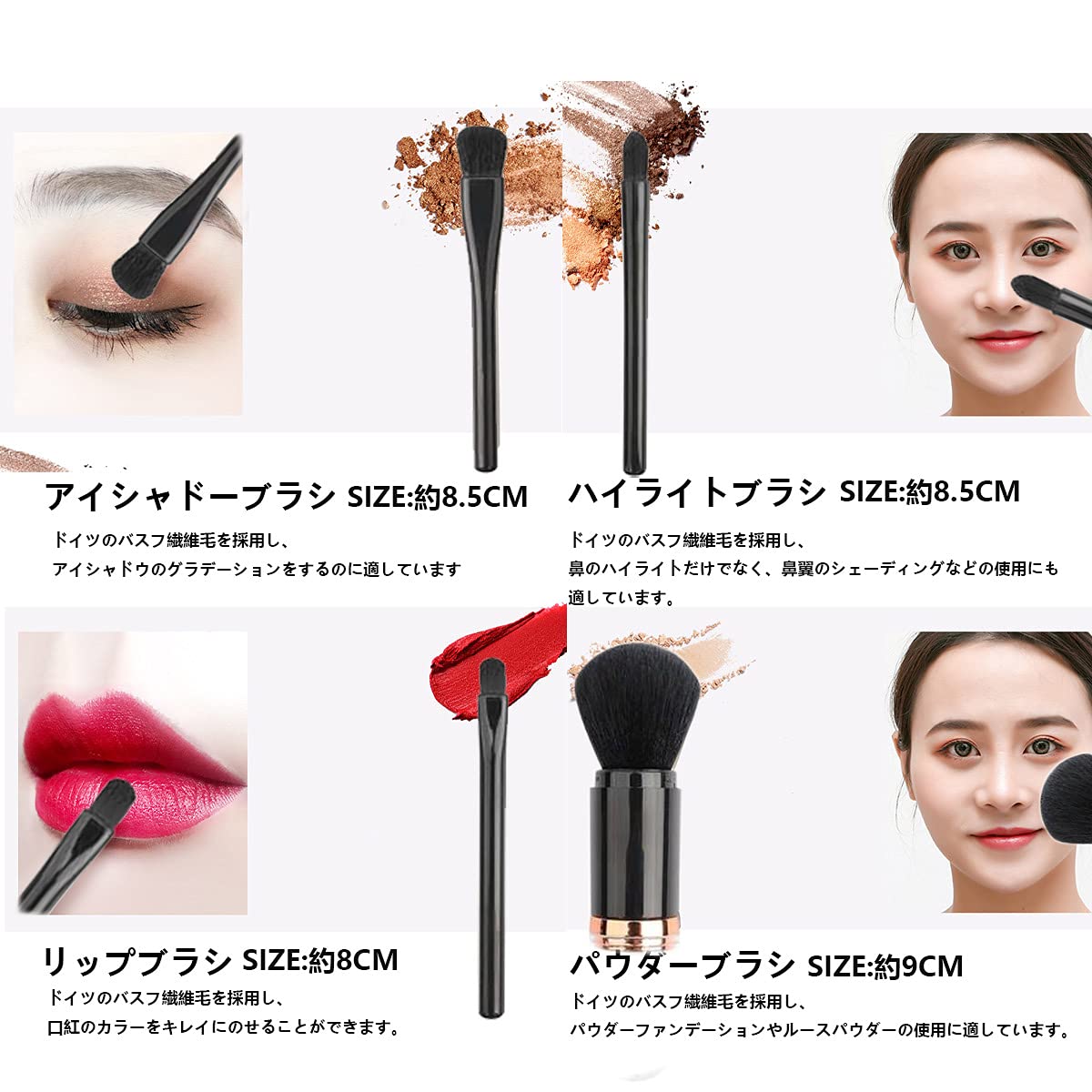 【ユニークなデザイン】パウダーブラシの先はフワフワ感のある扇型デザインを採用し、フェイスパウダー ブラシをお肌に密着させるます。適量のパウダーをつけ、肌のキメにそって顔全体を軽くブラシングするように優しく塗ります。アイシャドーブラシが目にフィットするように、ふんわりとした楕円形のデザインにして化粧時の目の部の不快感を減らす。適量のアイシャドウをつけ、目尻から目頭に向けて丁寧に塗り広げます。ハイライトブラシは、ふっくらとした丸いブラシヘッドを採用し、小型の筆のような外観をしており、化粧時に絵を描いたような感じがして、肌に快適です。目頭から鼻筋のライン沿ってナチュラルな感じでつなげて塗ります、ぼかしながら塗り広げます。リップブラシはフラット形状のヘッドを采用し、口紅を塗る際に均一に塗ることができ、唇の色のディテールを強める。
