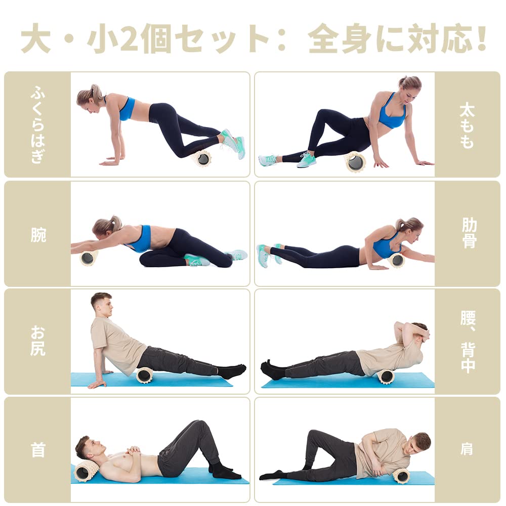 【全身に対応:お得な大・小2個セット】大きいフォームローラー:長さ33cm×直径14cm 小さいフォームローラー:長さ30.7cm×直径9.7cm フォームローラーは2個セット、サイズが違うので、身体の部位によって使い分けができます。直径が大きいため、全身をリラックスして、痛気持ちいい感じがあります。直径が小さいと仰向けで背中や腰をコロコロしやすく、とても楽になります。大きいフォームローラーは自宅でのご使用、小さいフォームローラーは持ち歩きに便利です。