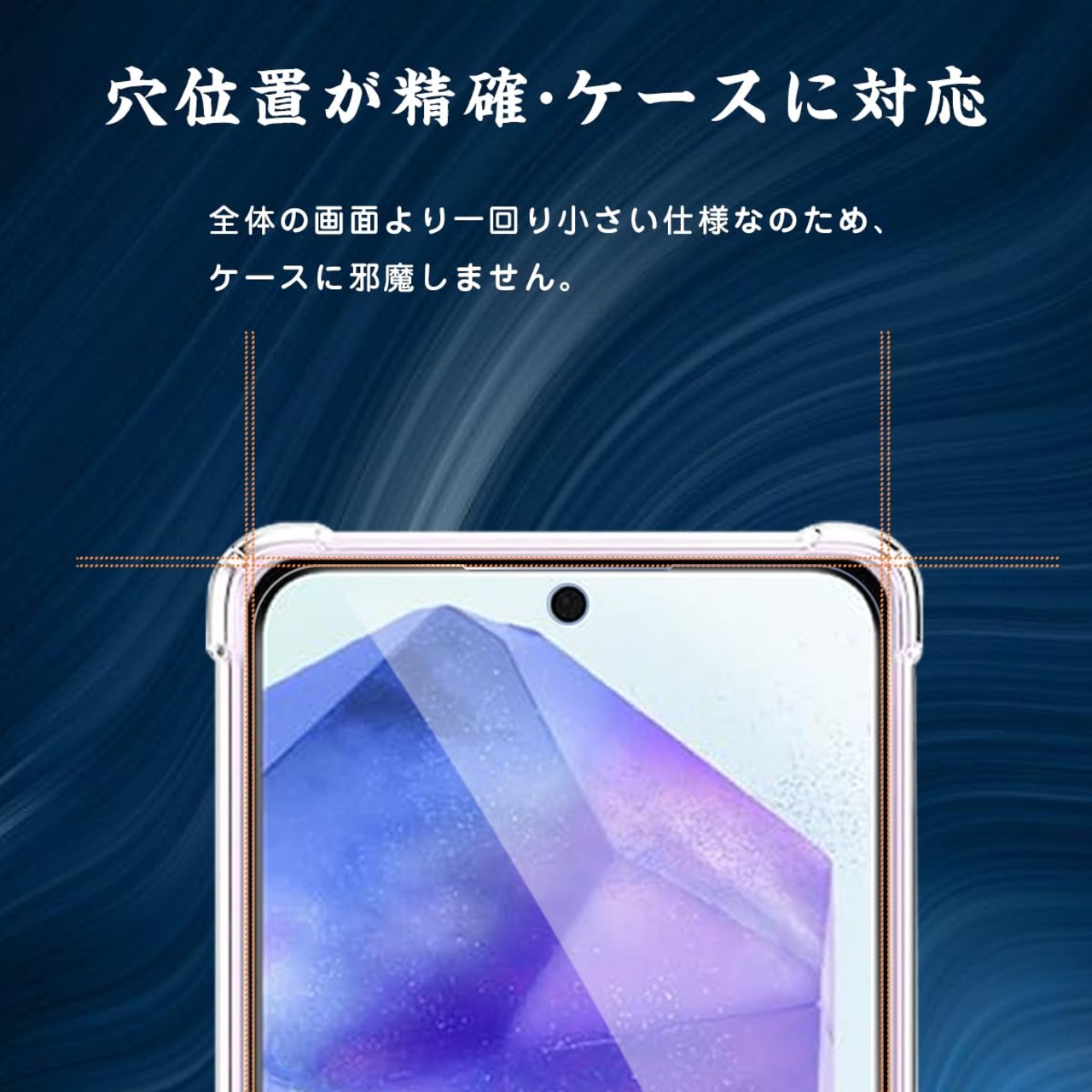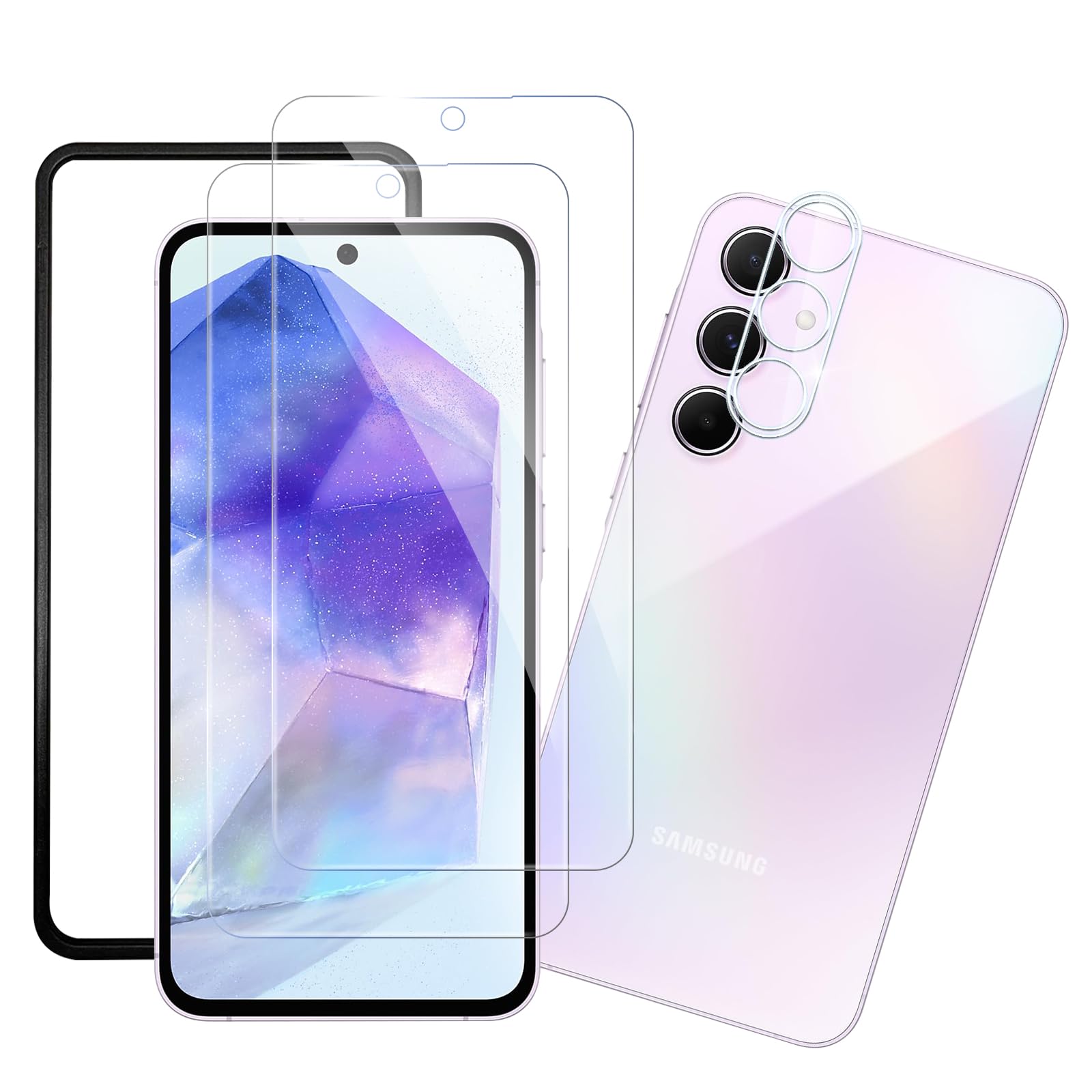 Galaxy A55 5G 対応 ガラスフィルム(2枚入り)+カメラフィルム(1枚入り)ガイド枠付き 貼り付け簡単 指紋認証対応 硬度9H 耐衝撃 飛散防止 撥水撥油 防指紋 高透過率 自動吸着 2.5Dラウンドエッジ 加工 Galaxy A55 5G 強化ガラス