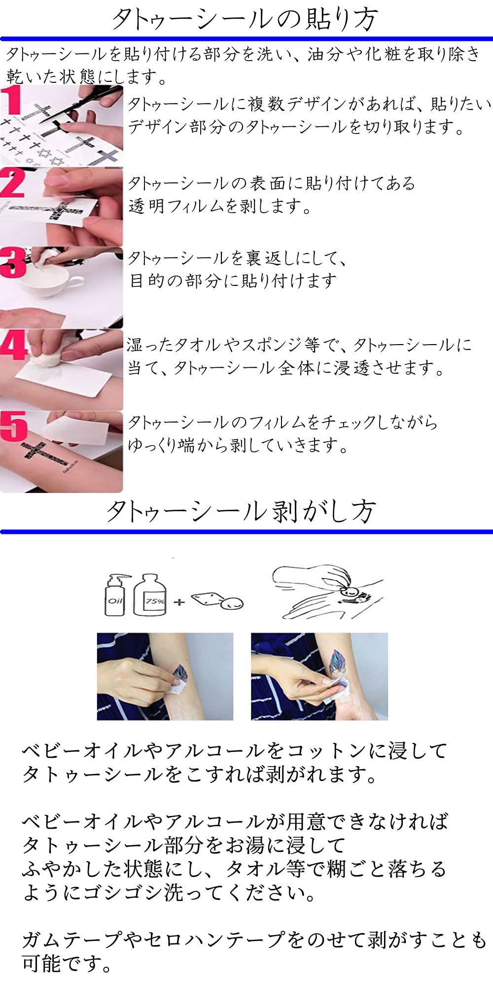 貼り付けたいタトゥーシールを切り取り、表面の透明保護シートを剥がし貼り付けたい箇所の汗や油分と取り除き、絵柄を肌面に触れるように台紙ごとタトゥーシールをのせて軽く押し付けます。水分を含んだスポンジなどで上から抑えながら十分に濡らし、2~30秒ほど待ちます。台紙をゆっくり剥がしていき余分な水分をとり乾けば完成です。