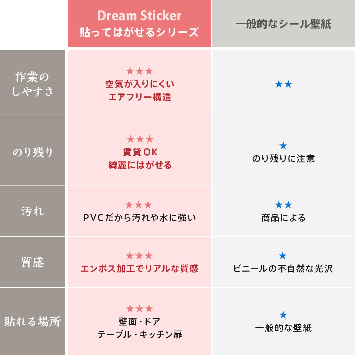 【賃貸でも安心!綺麗に剥がせる特殊粘着剤】粘着力がありながら綺麗に剥がせるのりを採用しているため、現状回復が必要な賃貸物件でも安心してお使いいただけます。汚れも拭き取りやすく、現在貼ってある壁紙クロスの傷や汚れ隠し、キッチン扉や引き出しの装飾・補修にもおすすめです。