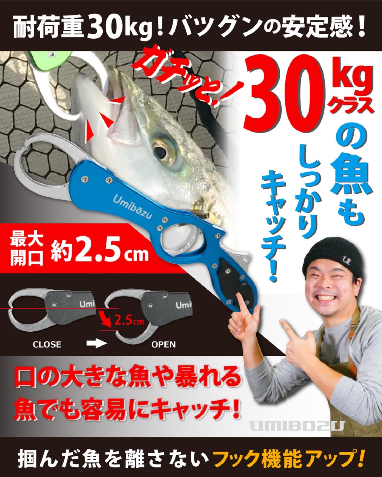 【多くの釣り好きの方の口コミから生まれたUmibōzuの万能フィッシュグリップ】 多くの釣り好きの方の口コミから生まれたUmibōzuの万能フィッシュグリップ。 重さは超軽量の約195g。 アルマイト加工された100%の航空技術用アルミニウム素材を使用していますので強度&錆止めがあり、耐久性に優れてたフィッシュキャッチャーです。 優れたデザイン性はもちろんのこと使いやすさを追求したピストル型でトリガーを引くと確実に魚をクリップ出来ます。軽量かつ、スムーズに動作しますので片手でも使用出来ます。 【コンパクトタイプのフィッシュグリップはオススメしません!】 コンパクトタイプは持ち運びに便利そうでデザインも可愛いと言う理由で購入する形もおられますがオススメしません。 理由は先端と指までの距離が近すぎるからです。 距離が近すぎると大きめのルアーの幅ですと指があたります。 魚が暴れると怪我の原因になります。 また、コンパクトタイプは持ち手が不十分な為持ちにくいです。 しっかりグリップの効いた持ちやすい製品であるかもフィッシュグリップ選びにとても重要です。