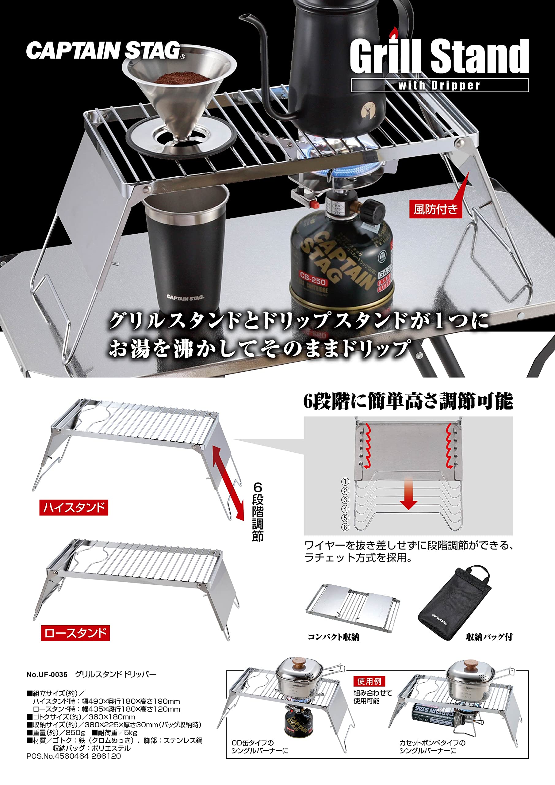 キャプテンスタッグ(CAPTAIN STAG) 五徳 ゴトク ドリッパー グリルスタンド ドリッパースタンド 高さ6段階調節可能 風防付き 収納バッグ付 UF-35/UF-38
