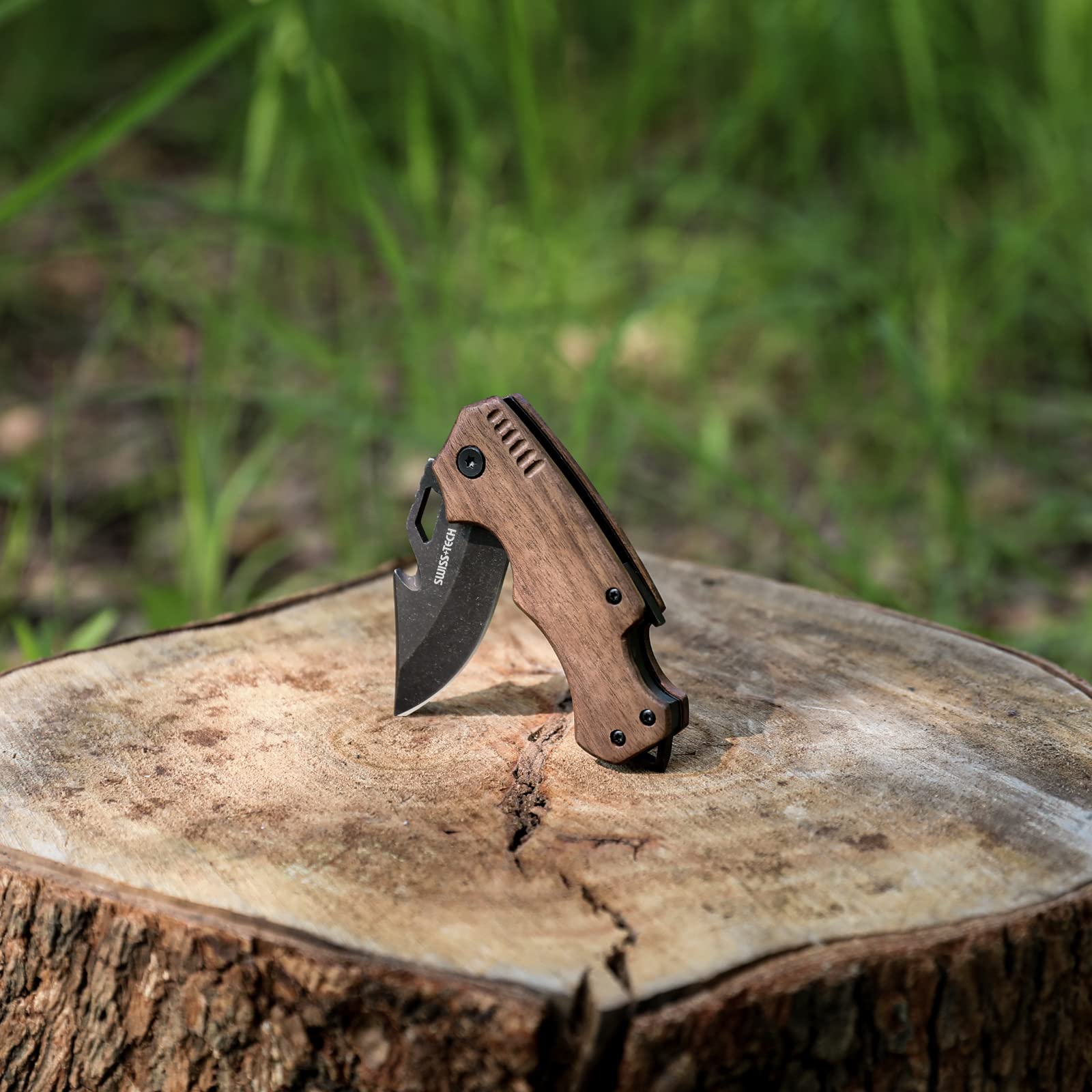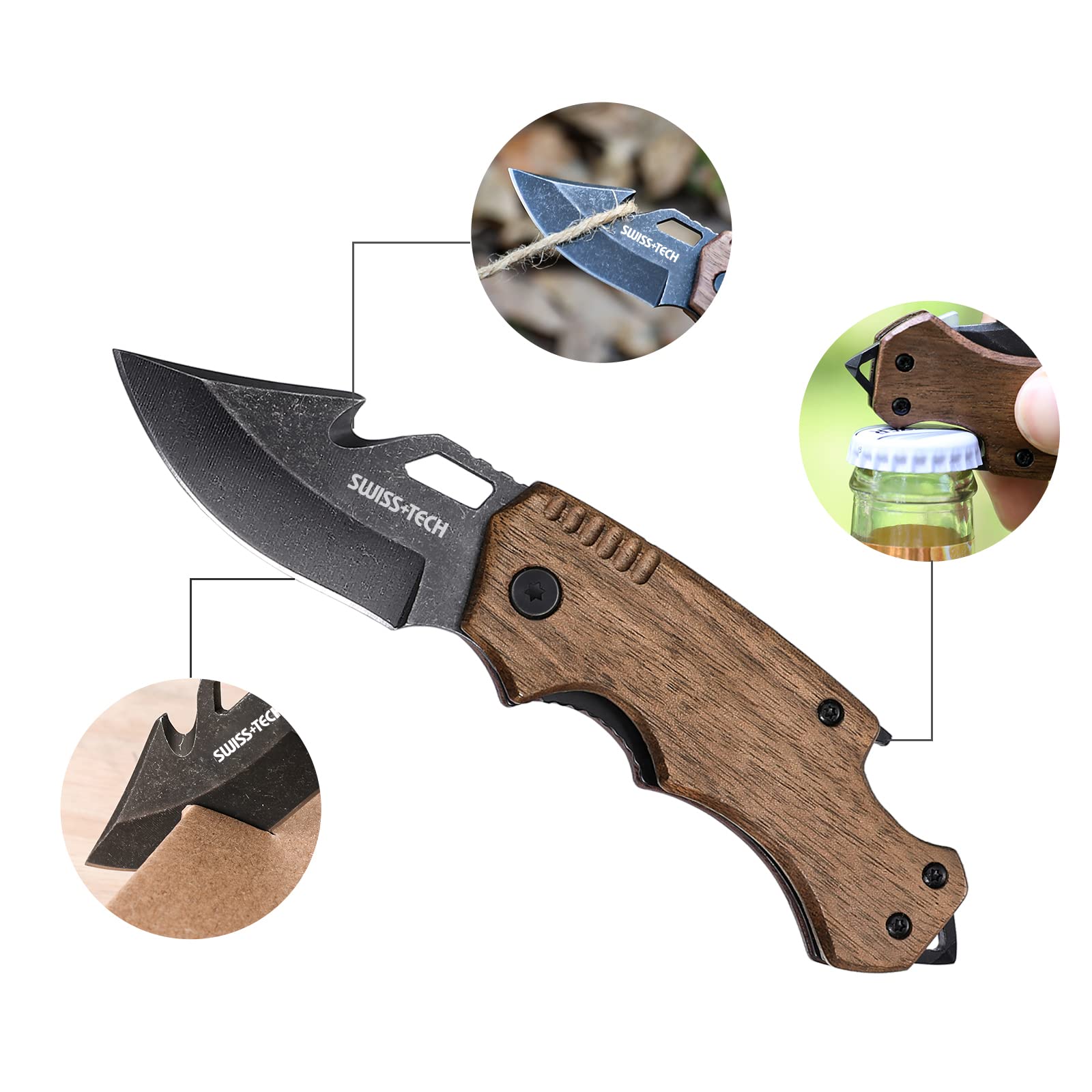 SWISS+TECH ナイフ ポケットナイフ 折りたたみ式 天然ウッドハンドル タクティカルナイフ アウトドア サバイバル ハンティング キャンプ 登山 釣り 防災用 多機能ナイフ